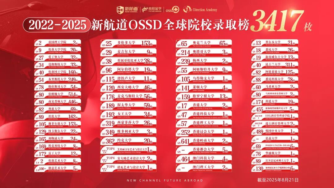 截至目前,新航道前程留学OSSD项目学生已斩获来自英国、加拿大、澳洲、美国、新西兰、荷兰、新加坡等多个国家和地区的录取Offer: