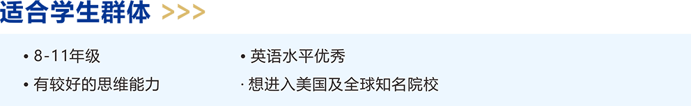 | T30B | 9-10年级,托福90+,或同等水平, 希望冲刺美国TOP30或同等世界名校的学生 |