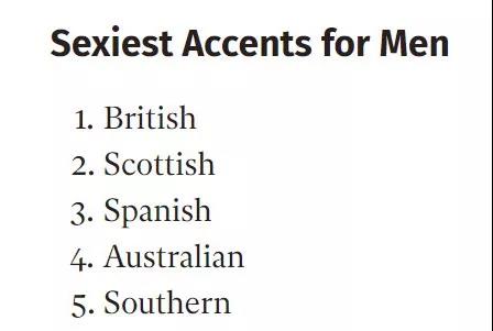 一共有1423名美国女性参与调查,20%的人把票投给了英音。苏格兰口音、西班牙口音、澳洲英语和南部口音紧跟其后,前五名看这里↓↓↓