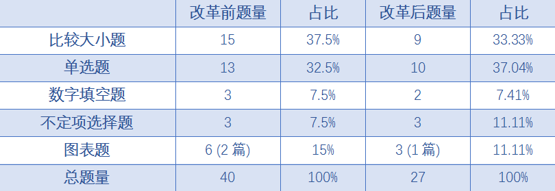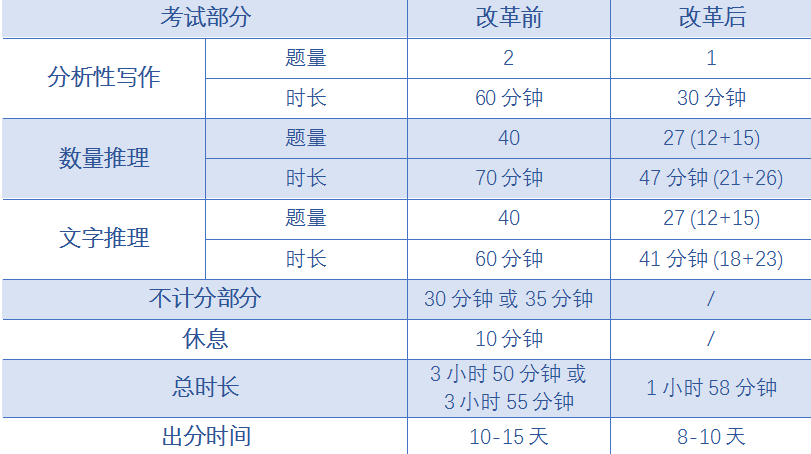 1. 改革前总题量40题,如果遇到加试则为60题,改革后直接取消加试板块,题量减少至27题,算术/代数/几何/数据分析/图表题的考点没有发生改变,单题的做题时间没有明显变化,并且题型组成也依然是比较大小题和单选题占多数;