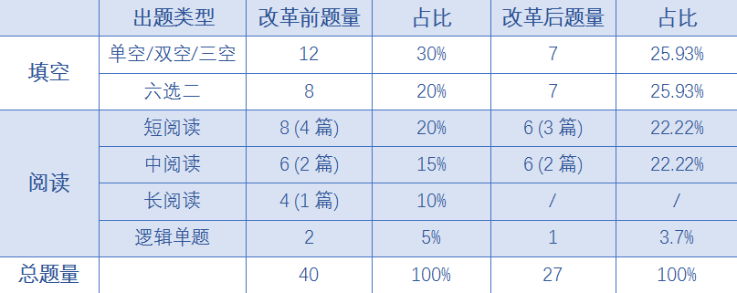 2. 填空部分:改革后2个section的填空部分共14题,其中六选二占了7题,占比从之前的20%变成了25.93%,这是较改革前的变化;
