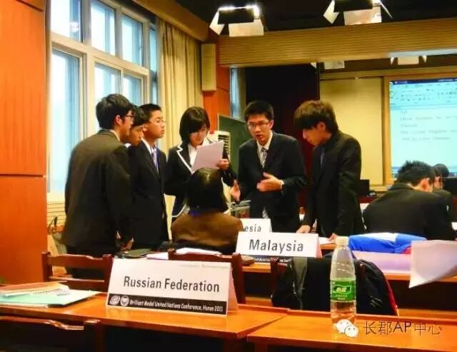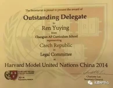 ▲ 2014年 3月20日至23日在亚运村的北京国际会议中心举办的2014哈佛模拟联合国会议(中国),AP1203 班任雨莹同学在联合国大会立法委员会中作为捷克共和国代表从海内外千余名代表中脱颖而出,荣获“杰出代表”的奖项,获得了哈佛模拟联合国组委会的高度评价。