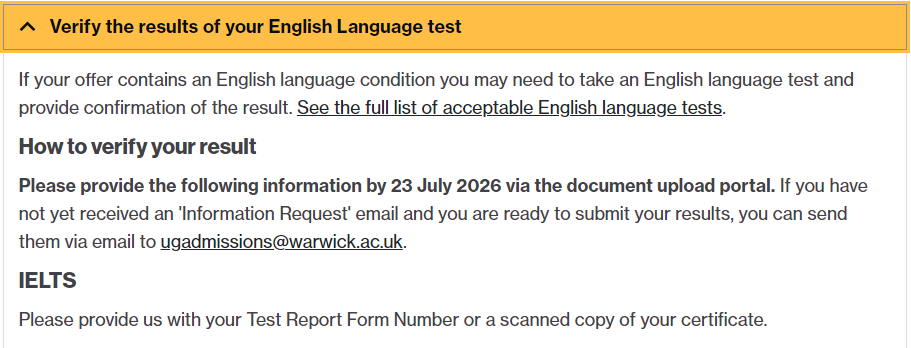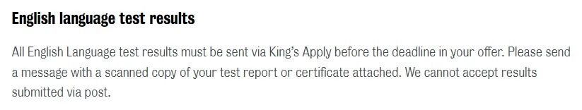 详见offer,在截止日前通过King's Apply发送。并在邮件中附上测试报告或证书的扫描件。不接受邮寄的成绩。