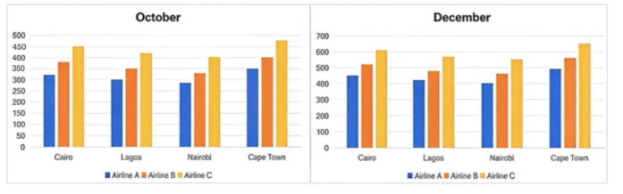Two months later, all three airlines saw a rise in their prices to all four destinations. Airline C’s flight to Cape Town saw the most pronounced increase to $650, with its fees for the remaining three cities growing by roughly $150 in December. The other two airlines experienced similar growth: Airline B's fares rose slightly to between $450 and $550, whereas Airline A's prices remained the lowest, staying below $500 for each destination.