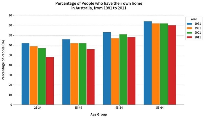 The chart below shows the percentage of people in Australia, by age group, who have their own home from 1981 to 2011.