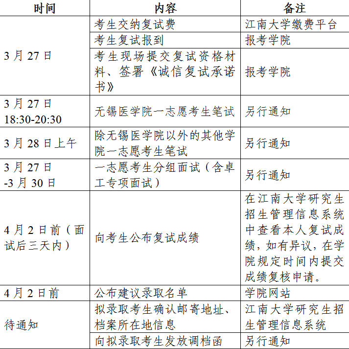 复试包括专业课考核和综合面试。专业课考核内容为“江南大学2026年硕士研究生招生目录”中公布的复试科目知识点,考核可以采取笔试、口试或实验技能测试等多种方式,具体形式以学院公布的细则为准;综合面试由专业素质考核和综合素质考核组成,成绩为各面试考官评分成绩的算术平均值。