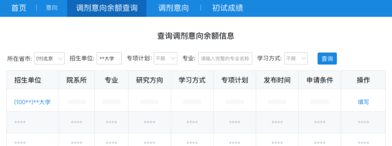 点击「调剂意向余额查询」,实时刷新查看目标院校调剂缺额。信息持续更新,务必多蹲守、多核对。