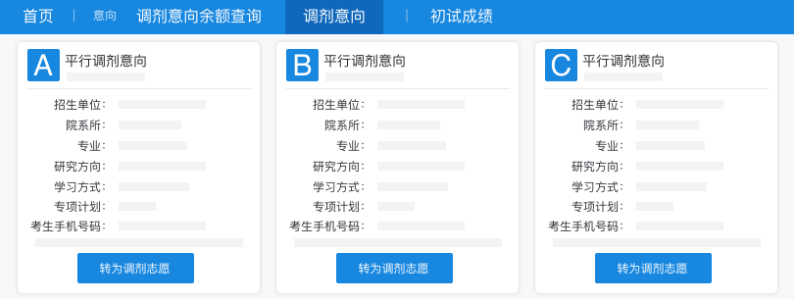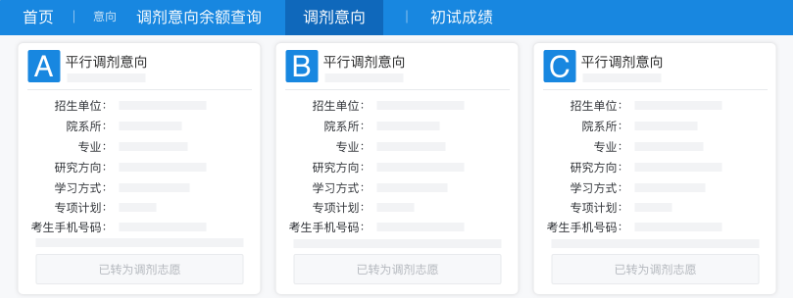 确认目标院校后,点击「调剂意向」,按系统提示填写。最多填10个平行意向,提交后不可更改,务必慎重。
