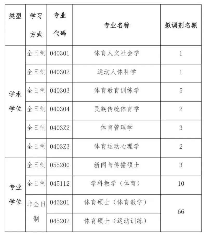 4、考生调入专业与志愿报考专业相同或相近,其中体育人文社会学拟接收调入专业为:体育人文社会学(040301)、体育教育训练学(040303)、民族传统体育学(040304)、体育管理学(自设专业)、体育运动心理学(自设专业)、体育学(040300);运动人体科学拟接收调入专业为:运动人体科学(040302);体育教育训练学拟接收调入专业为:体育教育训练学(040303)、民族传统体育学(040304)、体育学(040300);民族传统体育学拟接收调入专业为:民族传统体育学(040304)、体育教育训练学(040303)、体育学(040300);体育管理学拟接收调入专业为:体育管理学(自设专业)、体育学(040300)体育人文社会学(040301)、体育教育训练学(040303);体育运动心理学拟接收调入专业为:体育运动心理学(自设专业)、心理学(040200)、基础心理学(040201)、应用心理学(040203)、发展与教育心理学(040202)、运动人体科学(040302)、体育教育训练学(040303)、体育人文社会学(040301)、运动医学(105114)、体育学(040300);体育硕士(非全日制)拟接收调入领域及专业为:体育硕士(045200、045201、045202、045203、045204)、体育教育训练学(040303)、民族传统体育学(040304)、体育学(040300);新闻与传播硕士、学科教学(体育)只接收与原报考相同专业的考生调剂。