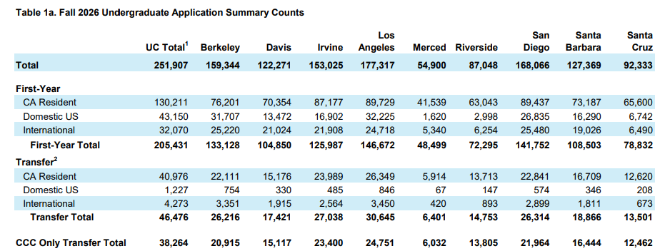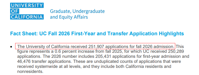 而在此之前,UC系统率先公布了2026Fall申请数据 ——总申请量达251,907份,刷新历史纪录。