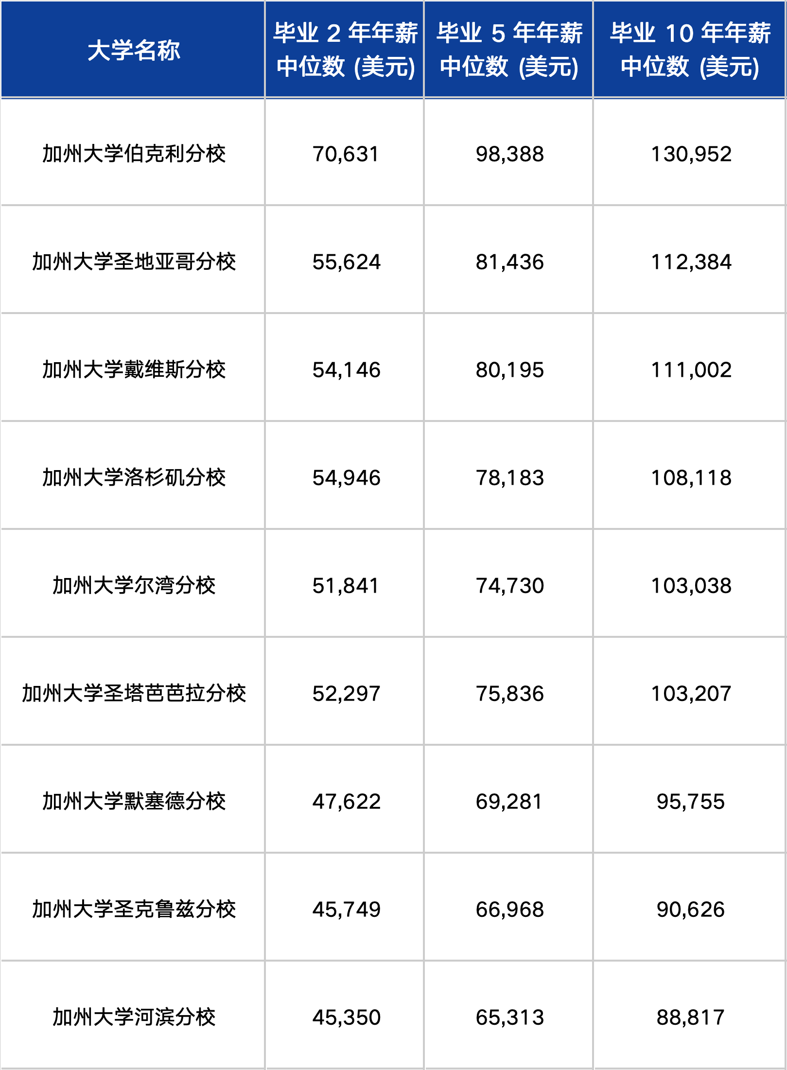 从毕业2年、5年、10年的薪资中位数来看,UCB毫无悬念稳居UC九校,成为 “吸金” 分校,毕业两年年薪中位数可高达70631美元。