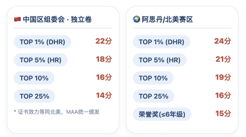 中国版试题独立划定的分数线,与美国本土及其他国家的分数线具有完全同等的效力与认可度。所有奖项证书均由美国数学协会(MAA)统一制作颁发,证书上不体现国别与分数线差异,仅显示考生所获得的相应奖项级别。