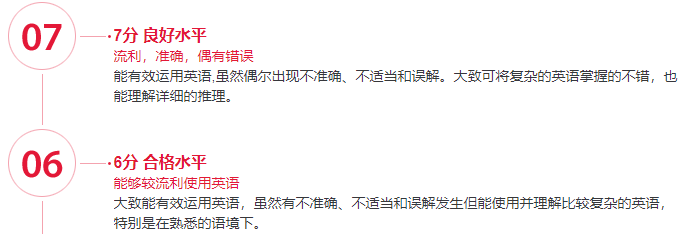 共8个等级分为A-H,等级为A级,要求总分7.5分,单项成绩不低于7.0分。等级为H级,要求总分6.5分,单项成绩不低于6.0分。