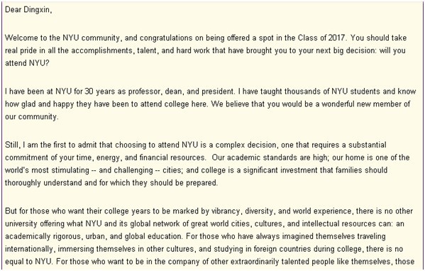 点评:胡同学是人大附中西山分校区的学生,这并不妨碍他优异的学习成绩。在拿到她成绩单的时候,放眼望去满篇的90多分,GPA在申请的时候也是占 据重要地位的,接近完美的GPA让胡同学在申请的过程中也增加了一分自信。高挑的身材让她有机会体验模特的经历,也让她在学习好的同时拥有与众不同的特 色。父母都是搞经济的,她也顺利成章选择了经济学。纽约大学是她理想的大学,拿到录取的那一刻,梦想也就离她更近了一步。