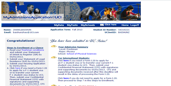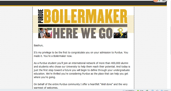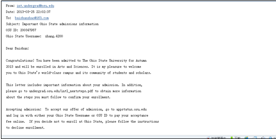 申请结果:加州大学欧文分校(综排44)、 俄亥俄州立大学(综排56)、普渡大学(综排65)德雷塞尔大学-奖学金10000美元(综排83)、尤西纽斯学院(文排75)