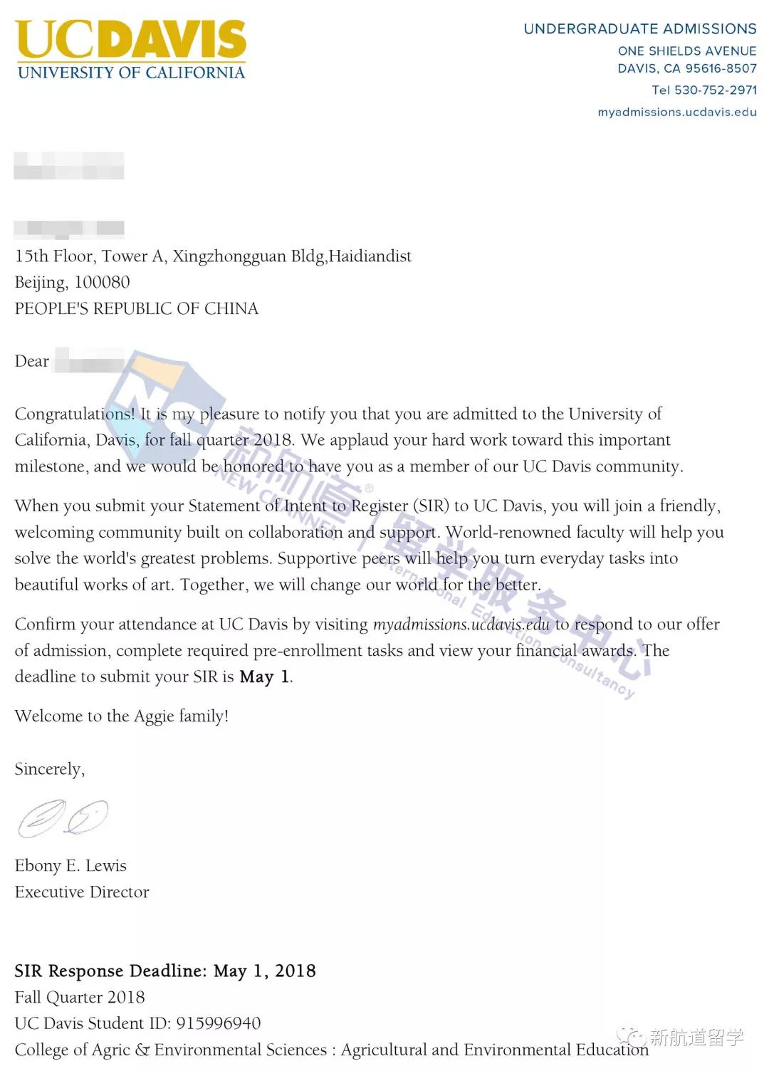 学生学校采用的是naviance系统,我们督促学生跟学校沟通,及时把成绩单递交给申请的学校,并且在高三上的成绩出来之后,及时的递交给申请学校,保证申请状态的完整。最终,学生如愿以偿的获得了目标的冲刺学校的录取—加州大学戴维斯分校,由于农学是这个学校的优势专业,学生终于能够在一个的大学学习自己热爱的专业方向。学生也觉得无憾了。