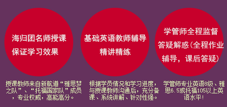 全封闭学院以出国考试、成功留学为导向,针对不同程度的考生,设置相应的课程。封闭学院拥有业内的团队,并采用业内领先的教材体系、国际化的教学管理流程,使学员不仅得到的学习效果,且提前感受到海外留学的氛围,为以后走向 英美澳、独立生活学习打下良好的基础。成立以来,得到了广大学员和家长的认可。