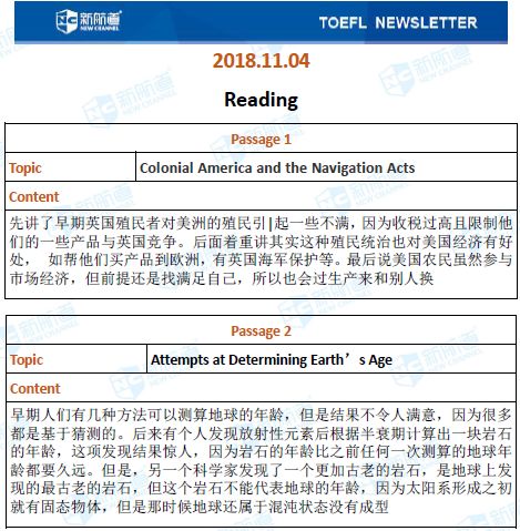 11月4日的托福考试,《新托福阅读真经5》命中了三道阅读,Test 5 Passage 1 与本场考试阅读部分 “Colonial America and the Navigation Acts ” 这篇文章重复;Test 1 Passage 3与“Attempts at Determining Earth’s Age”篇文章重复;Test 4 Passage 1与“The Idea of Continental Drift”篇文章重复。