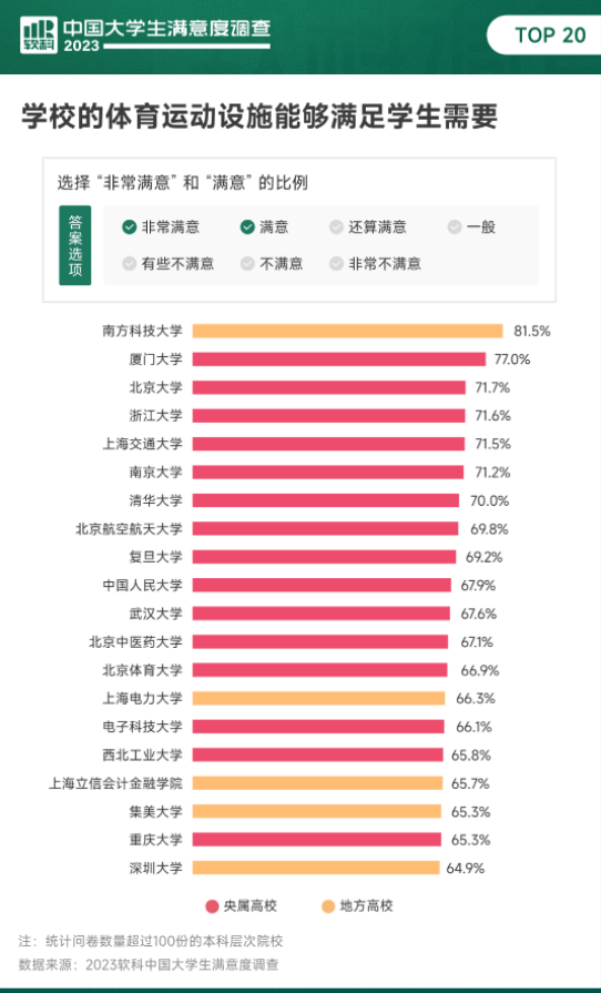 说完吃来讲下住宿,同样作为大学生在校生活关注度的项目,南方科技大学以92.2%的满意度断层(小编都有些想去体验一下南方科技大学的住宿了)。厦门大学、西南政法大学紧随其后,位列三甲,满意度分别为76.9%和75.4%。值得注意的是,郑州西亚斯学院是该项目上,满意度进入前20的一所民办高校,66.4%的学生感到满意。