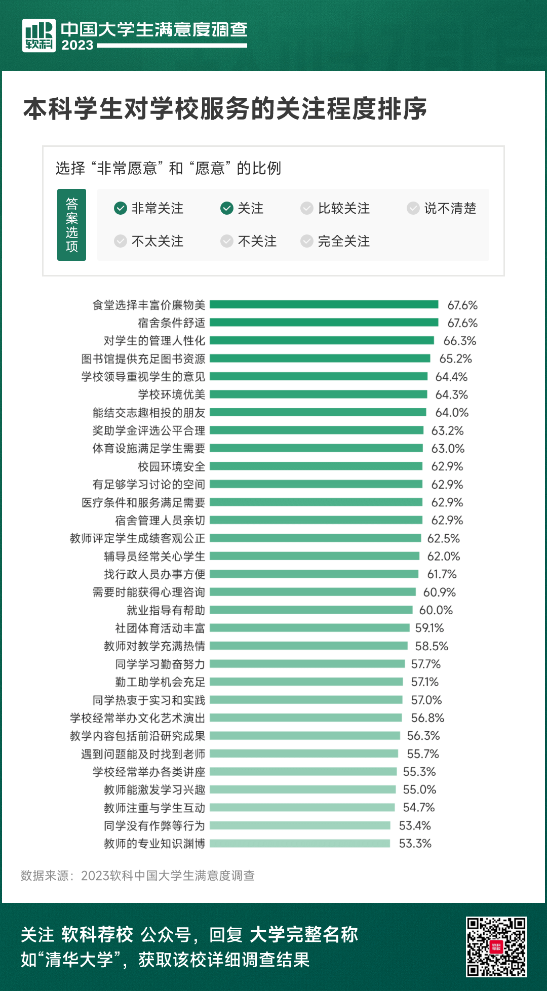 当然除了总体满意度之外,本次的调查还涉及了大学生学习生活的方方面面。而在学校服务的关注度方面,结果显示和2022年的满意度调查中一样,关注度的依然是“食堂选择丰富价廉物美”和“宿舍条件舒适”。