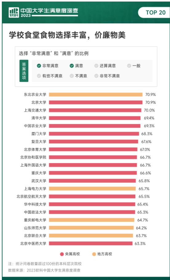作为学生关注度的项目,东北农业大学和北京大学并列,满意度高达70.9%,上海交通大学以微末只差位居第三。