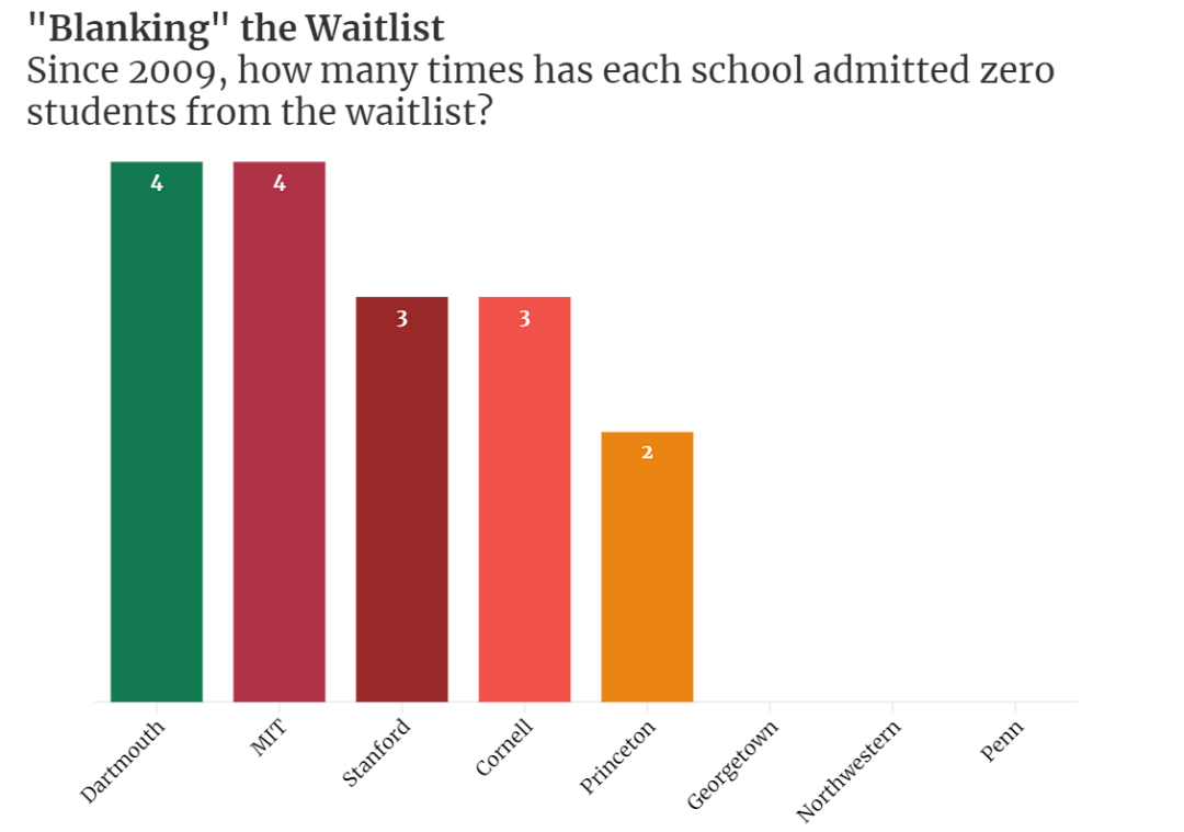 例如,《普林斯顿日报》(The Daily Princetonian)利用公共数据集(Common data Set)的数据分析了美国学院和大学的本科候补招生趋势,基于数据可知:自2009年以来,MIT/Dartmouth有4年未从候补名单转正学生,斯坦福/康奈尔也有3年未从候补名单转正学生。