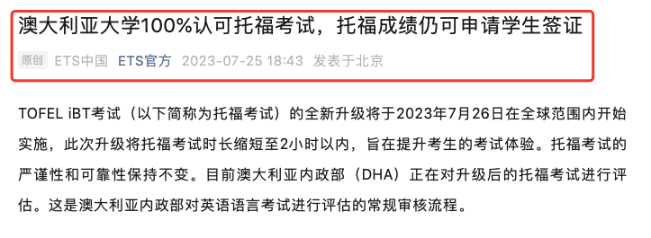 与此同时,考生在2023年7月26日之前取得的有效托福考试成绩仍可继续用于申请澳大利亚的各类签证。