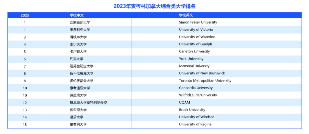 除此之外,维多利亚大学、滑铁卢大学、圭尔夫大学、卡尔顿大学、约克大学的排名也非常稳定,较去年没有变化,都是综合实力强的院校。