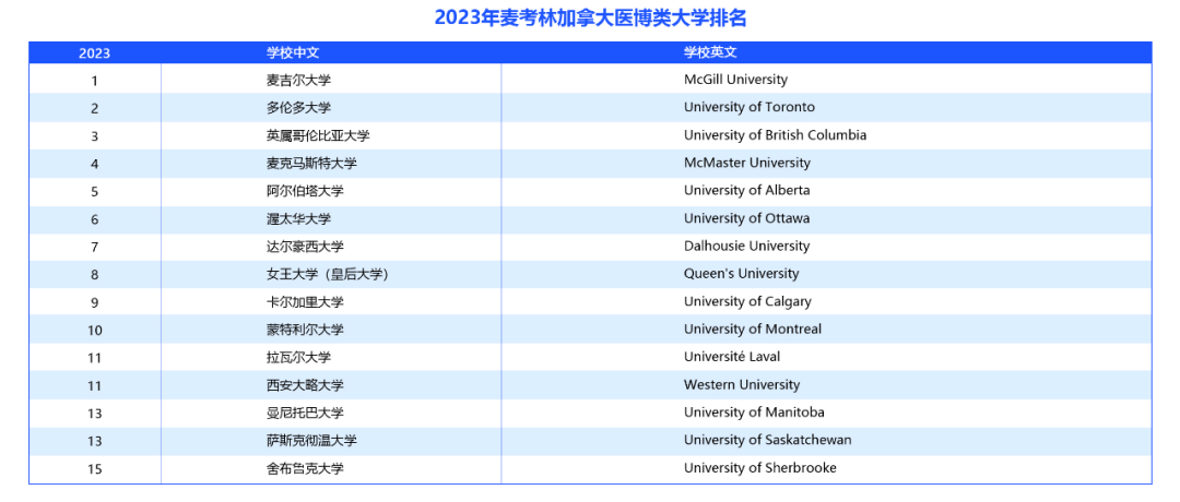 从2023年麦考林排名来看,医博类大学TOP4——麦吉尔大学、多伦多大学、英属哥伦比亚大学和麦克马斯特大学依旧保持稳定。