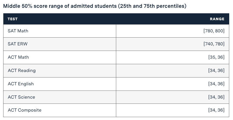 MIT公布了这些被录取学生的标化考试成绩(下表为排名中间50%成绩),毫无疑问,很多学生SAT/ACT成绩高到天花板,排名前25%的学生成绩几乎都是满分!