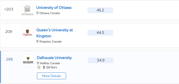此外,入围世界前500位的加拿大大学还有:渥太华大学、女王大学、达尔豪斯大学、西蒙菲莎大学、维多利亚大学、萨斯喀彻温大学、约克大学、康考迪亚大学、拉瓦尔大学、圭尔夫大学。