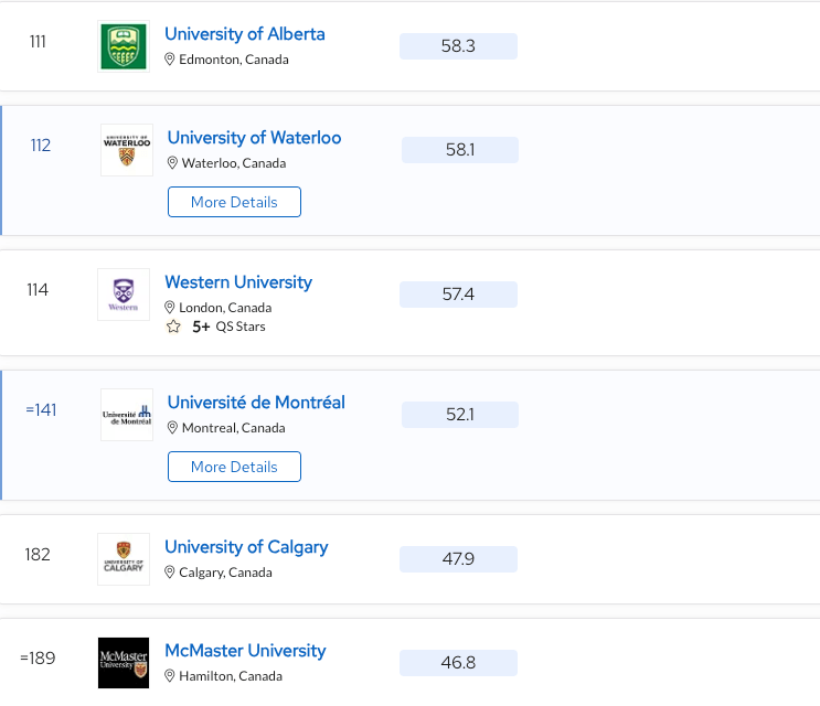 特别值得一提的是,滑铁卢大学由去年154位上升至112位,韦仕敦大学(西安大略大学)由去年172位上升至114位,卡尔加里大学由去年242位上升至182位,排名暴涨。