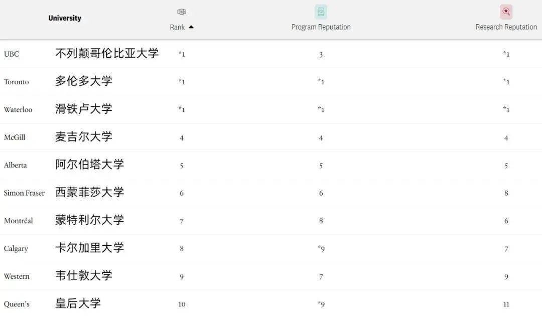 英属哥伦比亚大学UBC也很耀眼,在商科、计算机科学、教育三个榜单中和多大并列。
