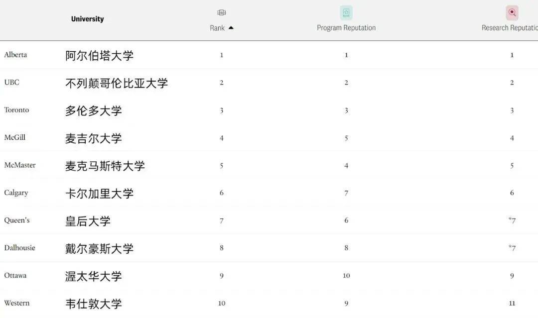 渥太华大学(第5名)和阿尔伯塔大学(第6名)互换名次,分别上升、下降1名;卡尔加里大学(第7名)上升2名。