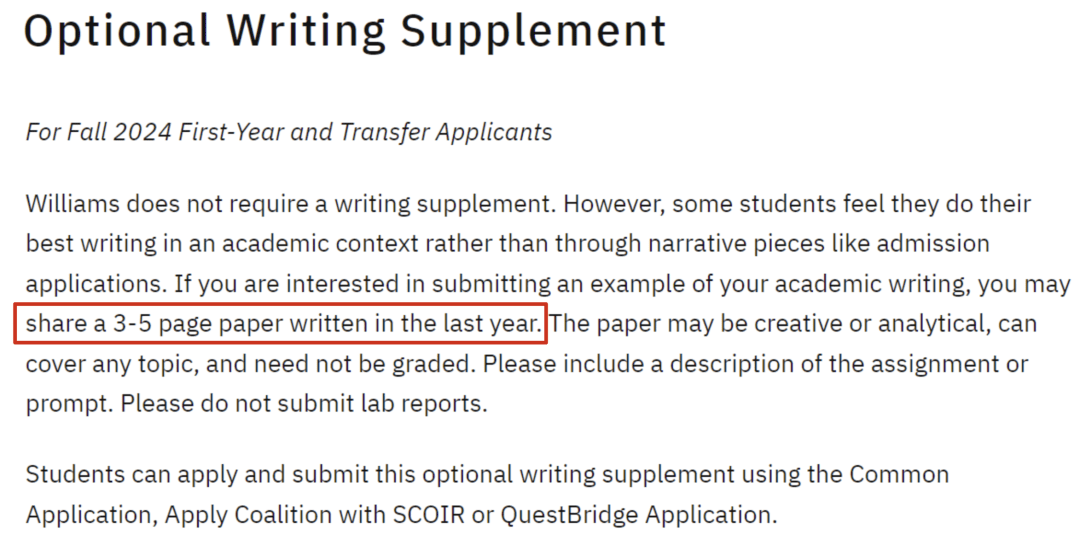 根据校方公告,过去,威廉姆斯学院曾强制提交或可选提交补充文书,申请者往往会写一篇150-300字的文章来展现他们的个性和学术兴趣。
