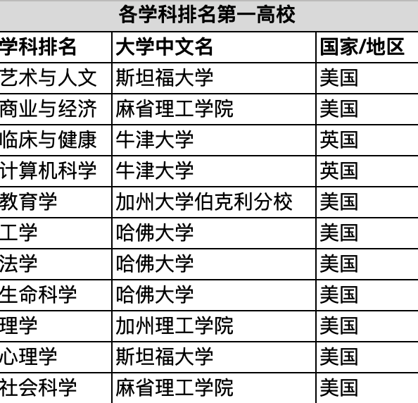 这份排名中哈佛大学的工学、法学、生命科学排名;临床与健康、计算机科学排名的为牛津大学;加州理工学院的理学排名。