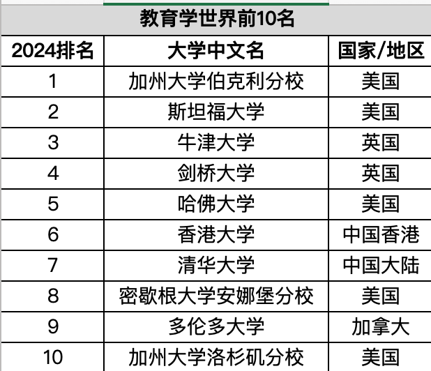 教育学世界前10名中,位列前三的分别为加州大学伯克利分校、斯坦福大学和牛津大学。
