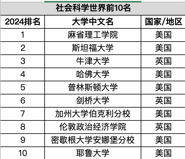 社会科学世界前10名中麻省理工学院位列,其次为斯坦福大学和牛津大学。