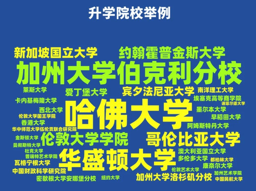 比较常见的升学院校包括英国的UCL、格拉斯哥;俄罗斯的莫斯科大学、俄罗斯人民友谊大学等;以及宾夕法尼亚(美)、香港浸会大学(中国香港)等。