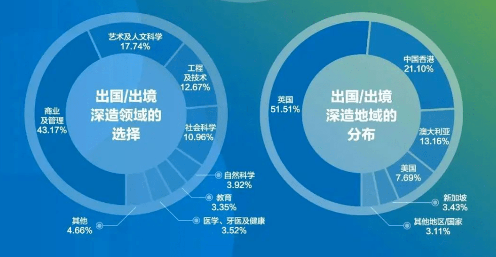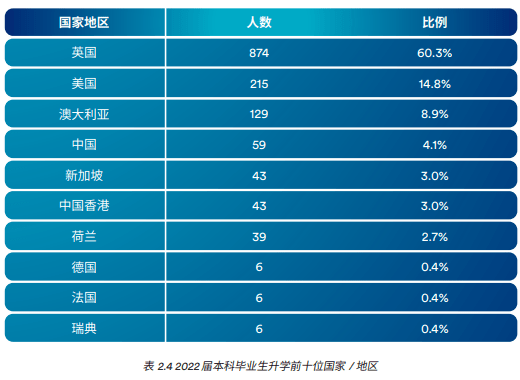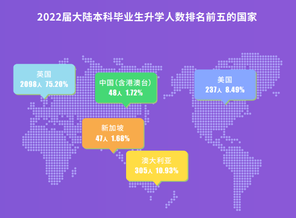 英国是升学国家的榜首,占比75%;还有10.93%的毕业生赴澳洲留学;8.49%赴美国。