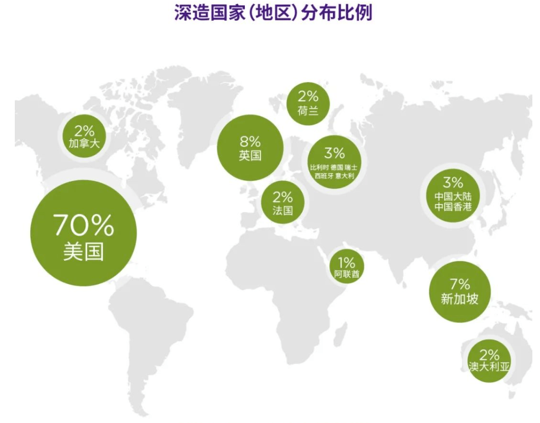 留学目的地TOP 1是美国,占比70%;其次是英国(8%)、新加坡(7%)。