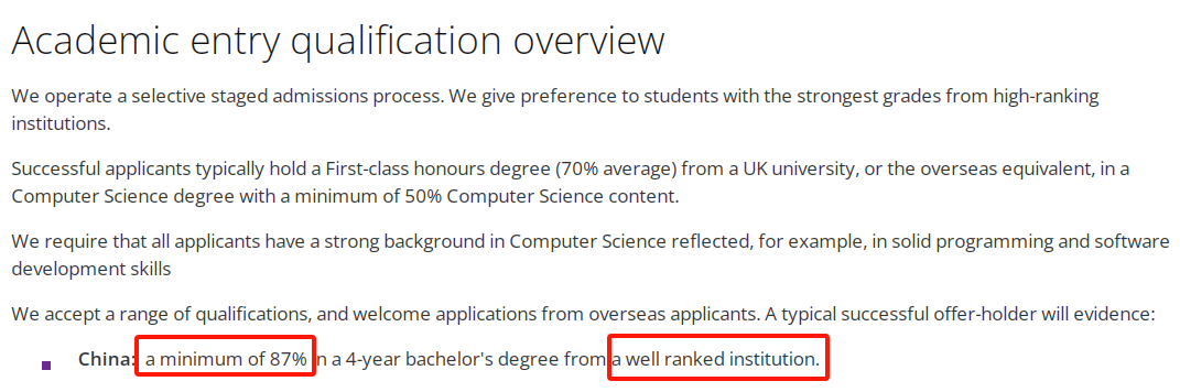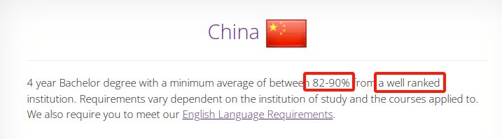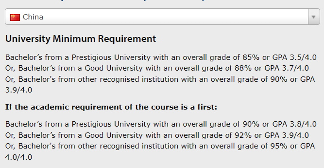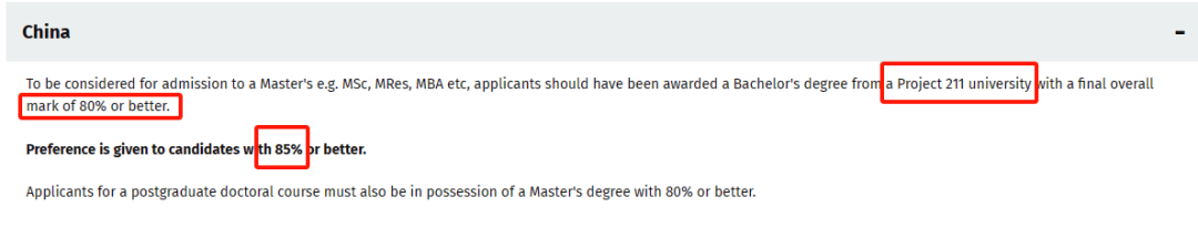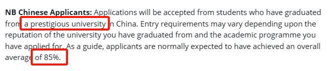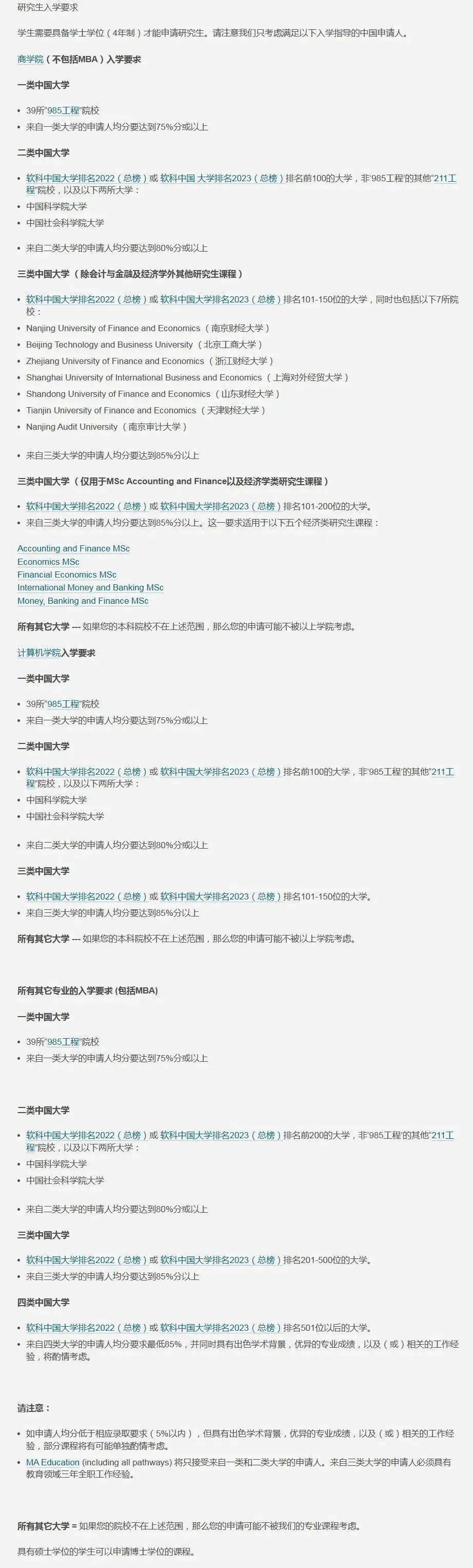 商学院及法学专业要求与其他专业不同。仅接受被英国ENIC评为大学/211/双大学,同时成绩需要达到85分以上。