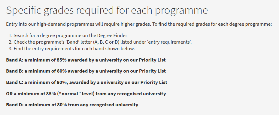 Band C:认可名单大学均分80%或其他认可大学均分85%