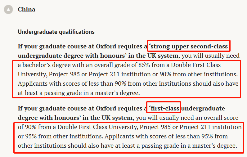 英本2:1及以上。LSE把中国大学分为highly regarded institution()和其他大学。