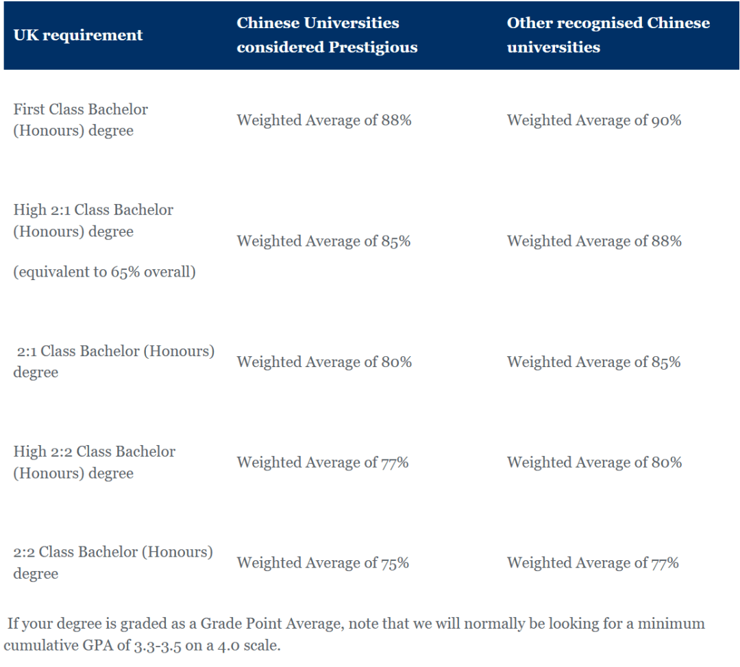 英本强二等一以上。将中国大学划分为 Prestigious(大学)、Good(大学)、other recognised(其他被认可的大学)三类。