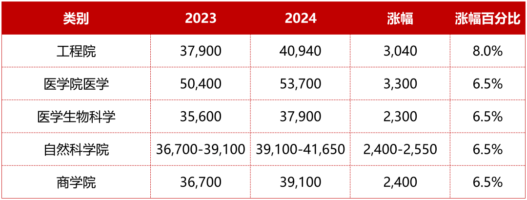 相比去年,24年秋季大一入学,三大学院专业国际生学费继续上涨3千镑左右,工程院涨幅,达到8%;其他学院涨幅在6.5%。