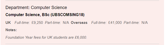大多数文科专业学费稍低,普遍£28,100(£26,200);科学学费稍高,计算机费用£41,000(£38,300)。