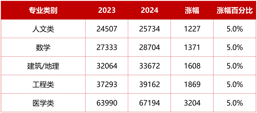 其他专业涨幅也都在£1000-3000左右,其中人文类专业涨幅最少,比如Anglo-Saxon,Norse,and Celtic、Archaeology、Asian and Middle Eastern Studies等,涨幅在£1000左右!