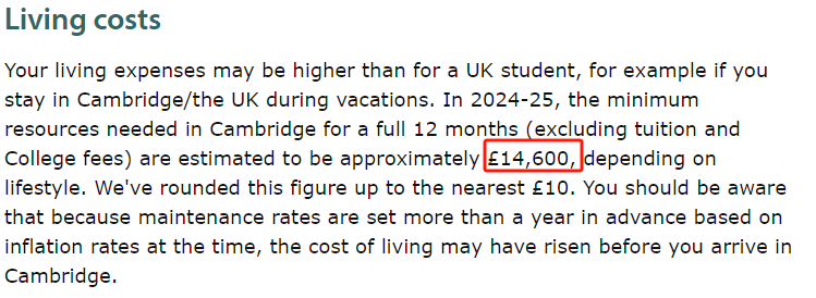 2024/25学年,剑桥大学一年所需的生活费估计约为£14,600(上一年预算£12,400)。当然了,具体还要取决于每个学生的生活方式。