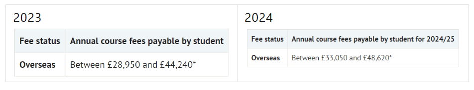 2024/25学年,国际生学费区间在£28,100-£41,000(上一年在£26,200-£38,300)之间。具体专业学费如下: